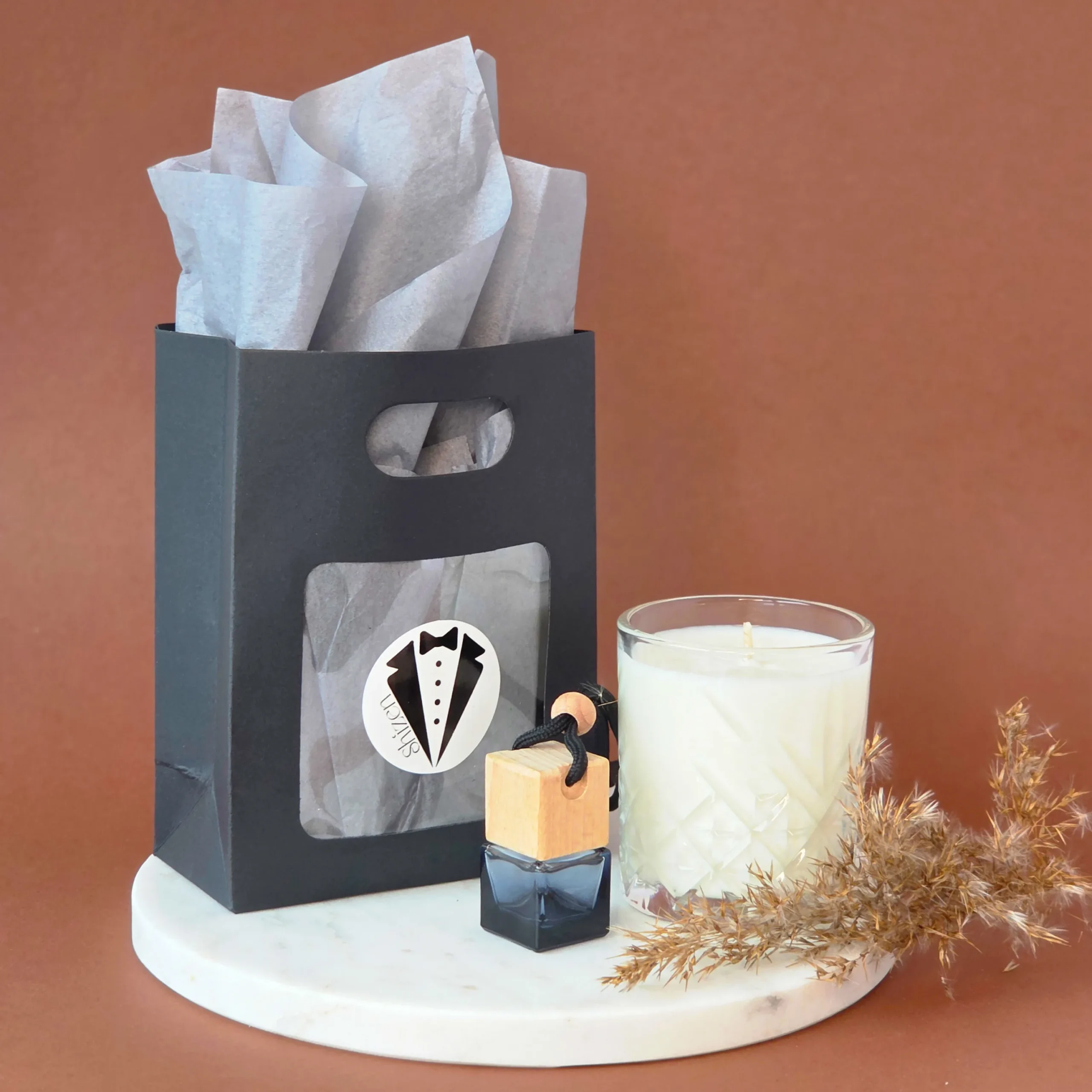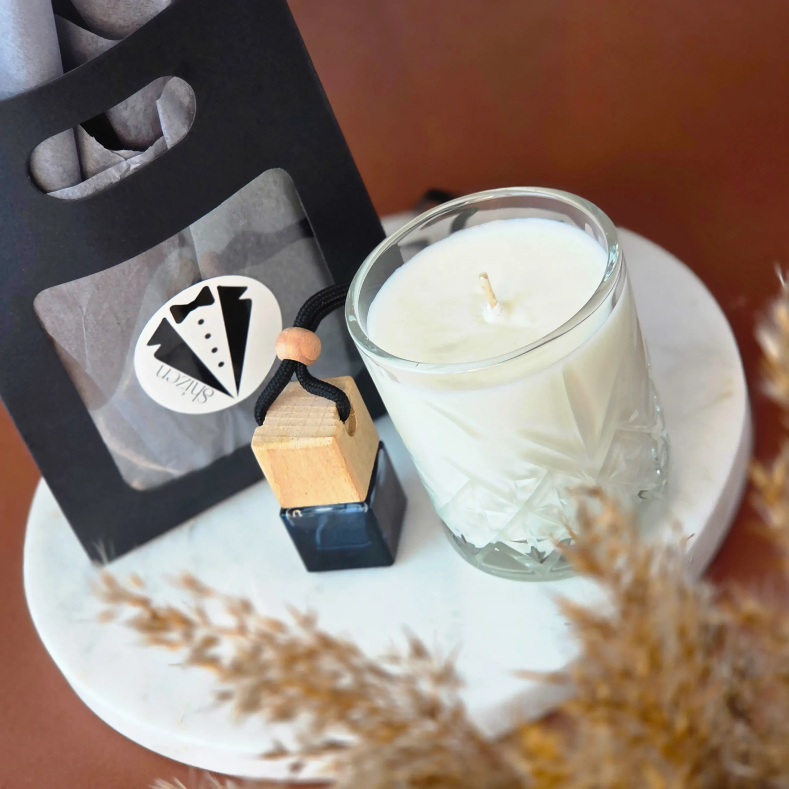 Kinkekomplekti kuuluvad käsitöö küünal ja autolõhnastaja mehele, kes hindab kvaliteeti ja meeleolu.
